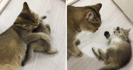 貓媽媽抱住寶寶幫洗澡 小屁貓「揮手賣萌扭屁屁」抵抗:鼻要啦~