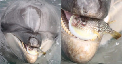 把河豚當球玩!海豚興奮叼起向飼養員炫耀